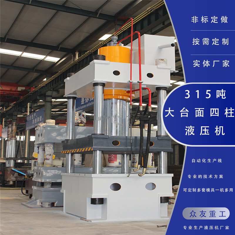 315吨大台面四柱油压机产品特点:三梁四柱结构,经济实用,液压控制采用插装阀集成系统,减少泄露点,动作可靠,使用寿命长,可实现定压和定程两种成形工艺,具备保压延时功能