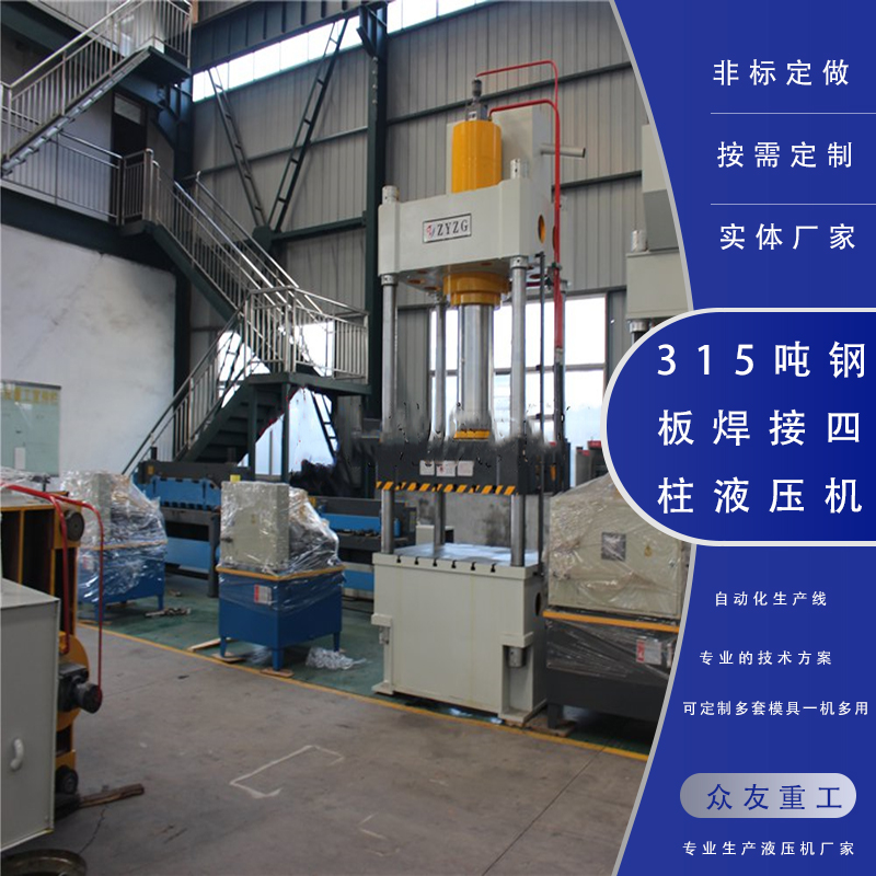 赢彩网welcome 315吨三梁四柱钢板焊接油压机产品特点:三梁四柱结构,经济实用,液压控制采用插装阀集成系统,减少泄露点,动作可靠,使用寿命长,可实现定压和定程两种成形工艺,具备保压延