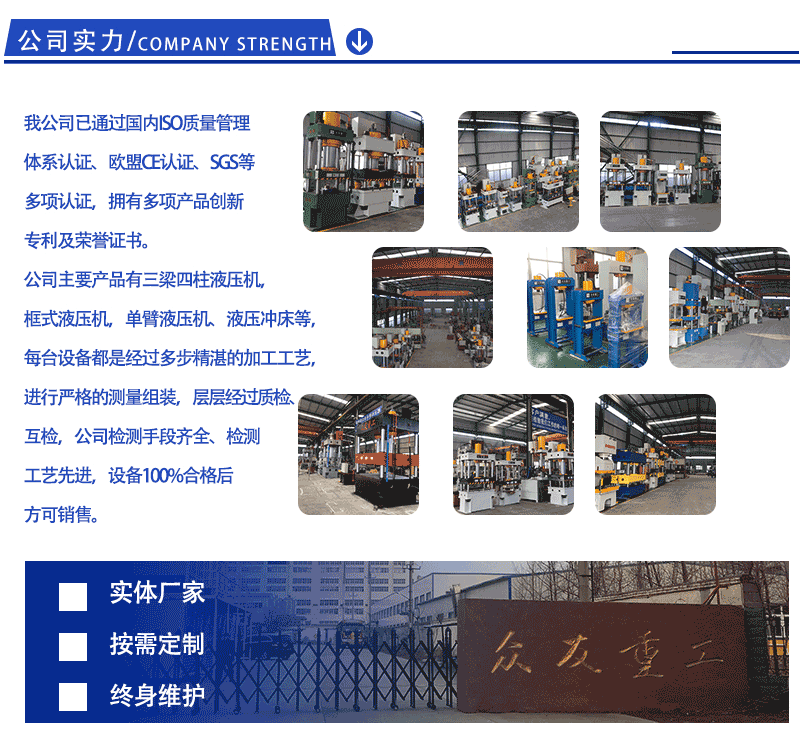 滕州众友重工机械设备有限公司是我国油压机、压力机专业生产企业之一, 公司拥有大型落地镗铣床、重型车床、铣床刨床等设备,工艺装备先进,专业生产常规油压机、四柱油压机、小型油压机、单臂油压机、多功能油压机、框式油压机、龙门油压机、卧式油压机、三梁四柱油压机各类油压机及汽保设备。公司与多家国有大型企业、独资合资及民营企业服务配套数十台,深受用户欢迎
