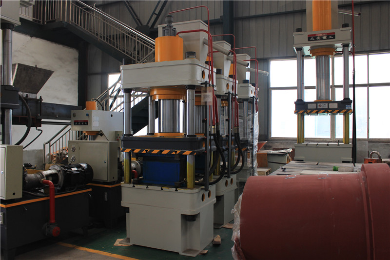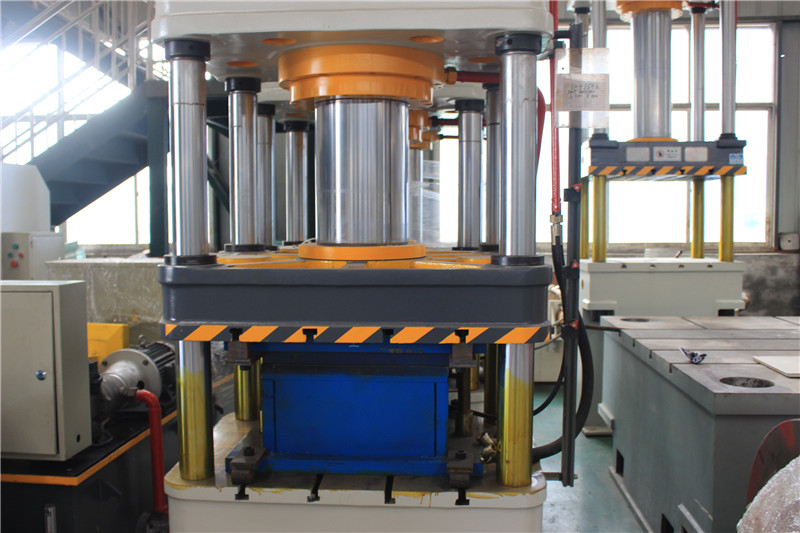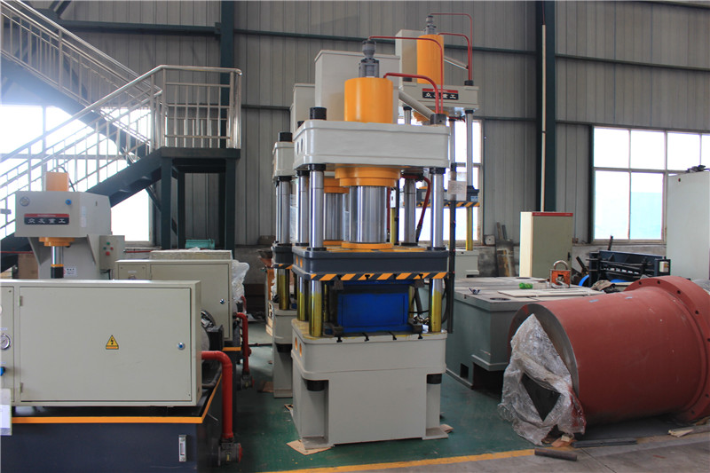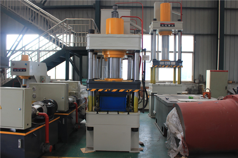 200吨不锈钢锅盖拉伸成型油压机它的显著特点是工作空间宽敞,整机结构简单,工艺性较好。机身由上横梁,活动横梁,工作台和四根立柱组成,工作缸安装在上横梁内,活动横梁与工作缸的活塞联接成一整体,以立柱为导向做上下运动,并传递工作缸的内产生力量,对制件进行压力加工