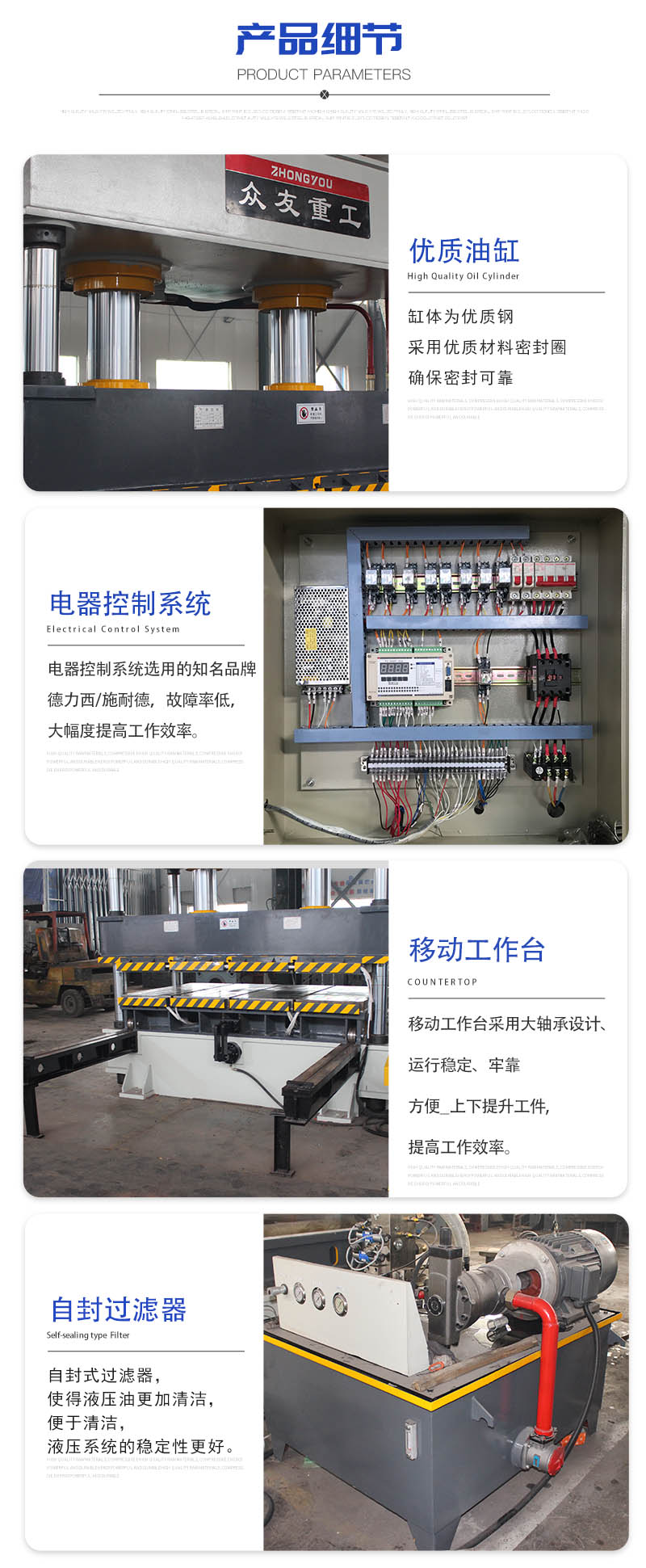 2.315吨双缸四柱移315动工作台带加热板油压机活动横梁二段速度控制空载高速、慢速靠模拉深; 活动横梁上下限位保护,行程可调整