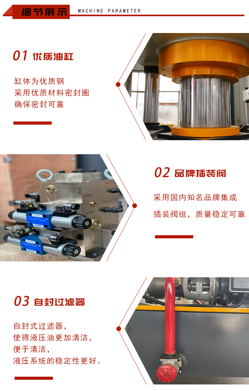 2、采用四柱导向结构,导向精度高,抗侧向力强,适用于压制精度要求高、不对称产品
