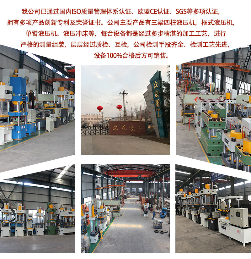 我公司专业生产四柱油压机、单臂油压机、框式油压机、龙门油压机、封头拉伸机、油压机拉伸机、不锈钢铁皮门压 花机、粉末成型压块机等。可根据客户需要定制各种规格机器,并提供配套电器原理图,可提供机器上门安装调试。联系电话:13562463338