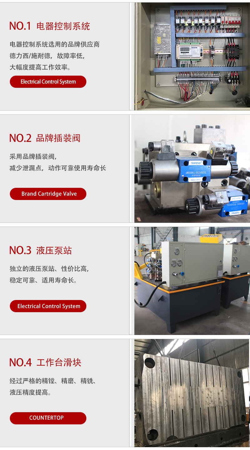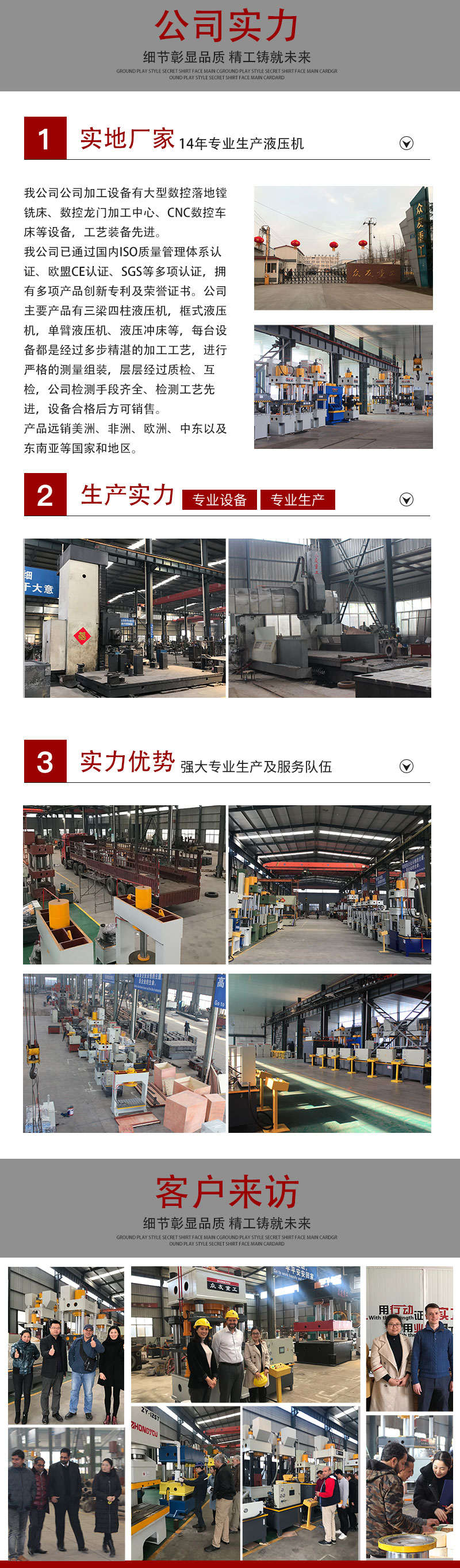 2、采用四柱导向结构,导向精度高,抗侧向力强,适用于压制精度要求高、不对称产品