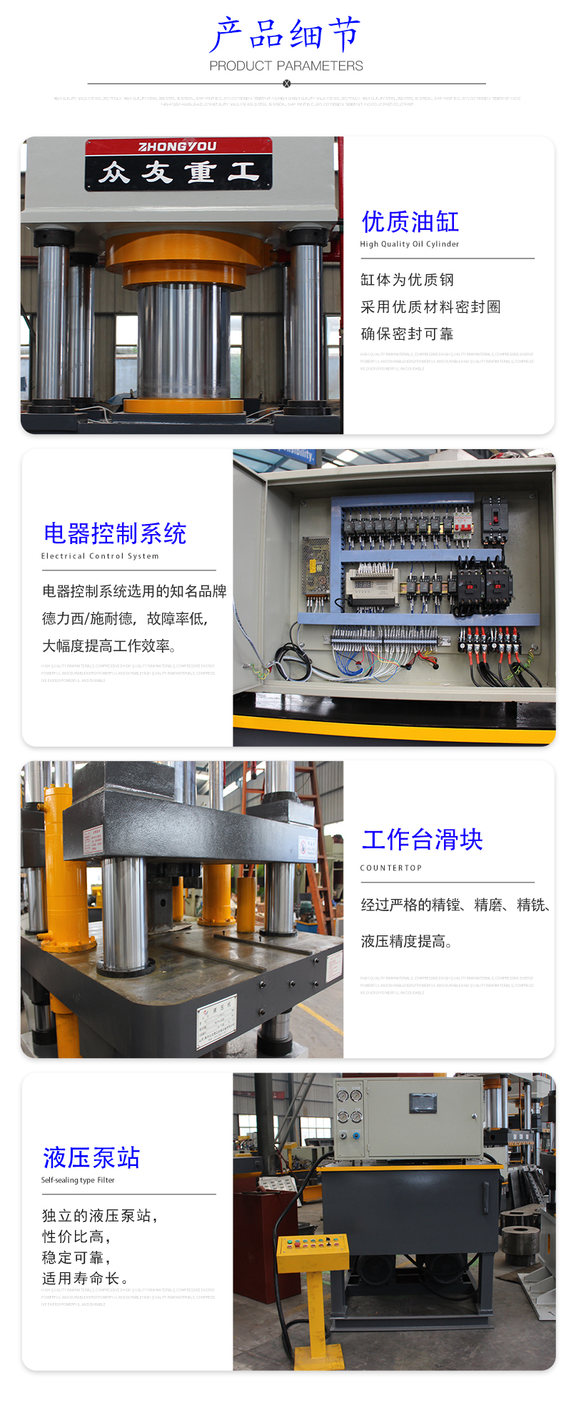 1、四柱式结构,机架与活动工作台导向精度高,刚性好,抗侧向力强,特别适用于压制不对称的产品;结构紧凑、性价比高 经济适用。