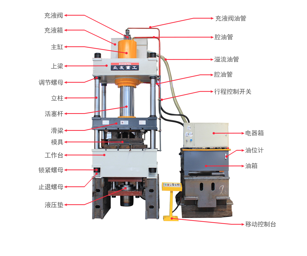 主机,机身采用三梁四柱式结构:它由上横梁、滑块、工作台、立柱、主缸、液压垫、液压动力系统及电器系统等部件组成。