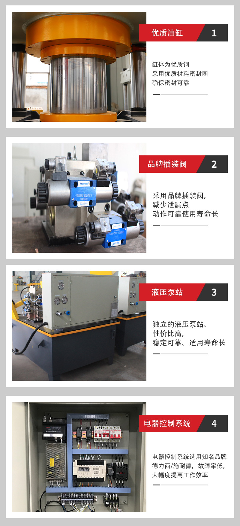 2、200吨不锈钢锅盖拉伸成型油压机液压控制采用插装阀集成系统,动作可靠,使用寿命长,液压冲击小,减少了连接管路与泄漏点。