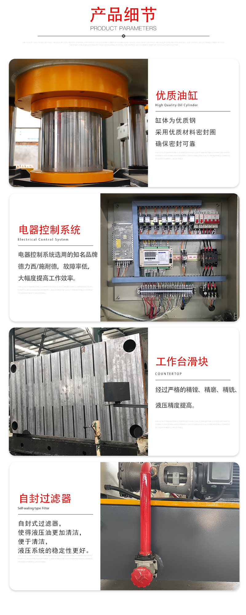 6.压力、行程、保压等可按压制工艺要求调整,采用进口液压、电器元件及密封件,经久耐用;