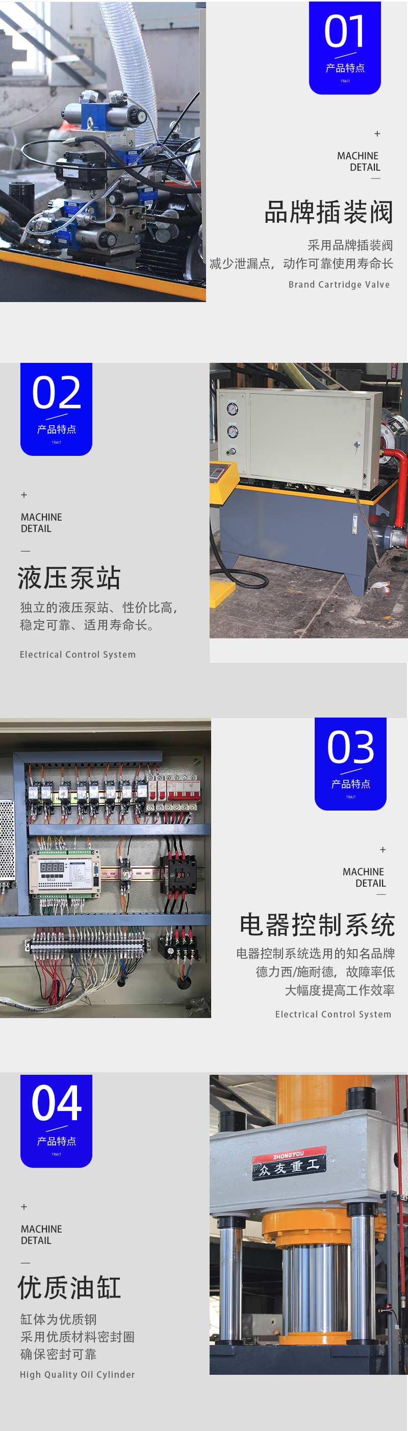 2、400吨漏粪板成型油压机液压控制采用插装阀集成系统,冲击小、动作可靠,泄露点少。
