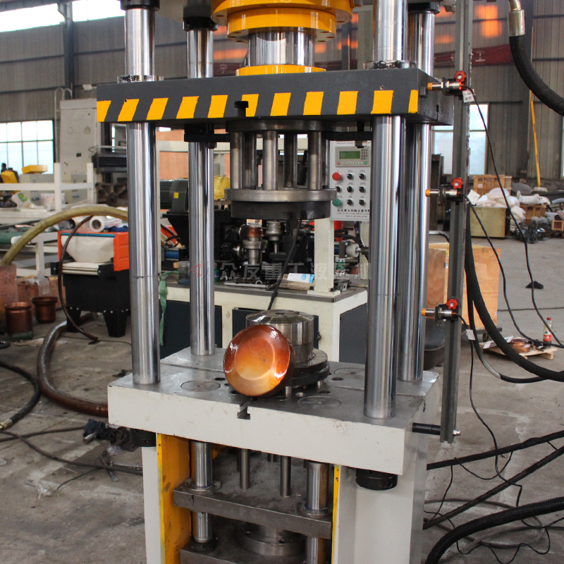 6、80吨压铜壶液压垫拉伸四柱油压机具有快速工进,慢速靠模功能,提高生产效率与模具使用寿命