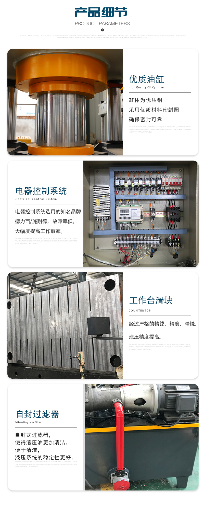 6.压力、行程、保压等可按压制工艺要求调整,采用进口液压、电器元件及密封件,经久耐用;